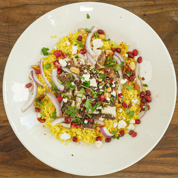 Make three middle eastern inspired dishes. Mezze platter, Za'atar Chicken & Rice Bowl with Pomegranate Seeds, and Street Cart Chicken & Yellow Rice